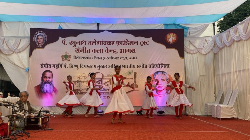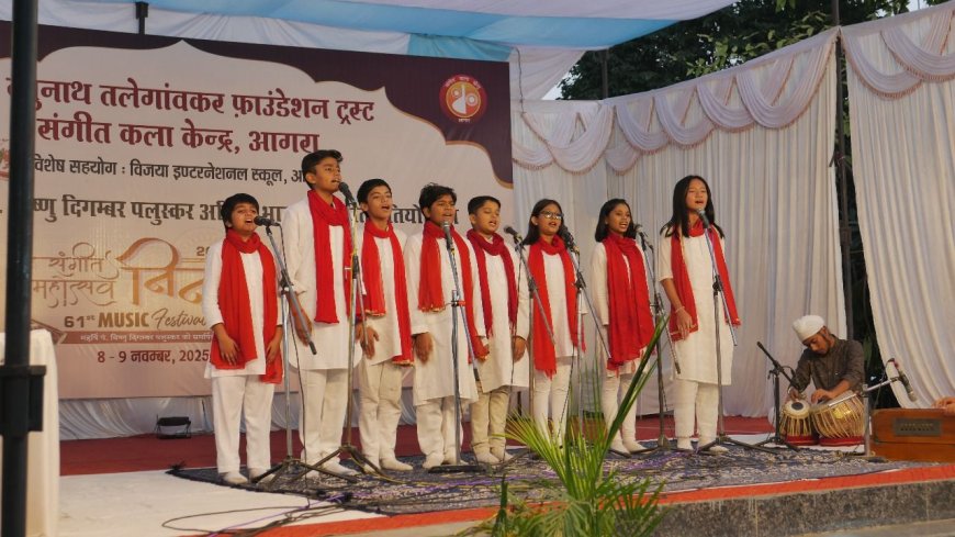आगरा। पं. रघुनाथ तलेगांवकर फ़ाउंडेशन ट्रस्ट एवं संगीत कला केन्द्र, आगरा के संयुक्त तत्वावधान में तथा विजया इंटरनेशनल स्कूल, बिचपुरी के विशेष सहयोग से संगीत महर्षि पं. विष्णु दिगंबर जी के पुण्य स्मरण में 61वीं निनाद संगीत प्रतियोगिता का भव्य आयोजन 8 एवं 9 नवम्बर 2025 को विजया इंटरनेशनल स्कूल, बिचपुरी, आगरा में सम्पन्न हुआ।