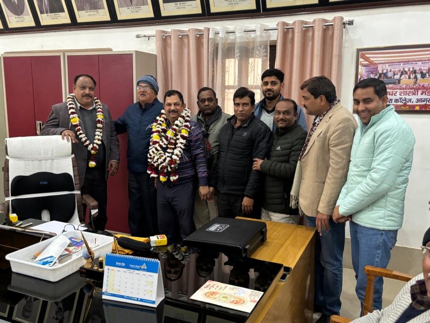 प्रो.विपिन कुमार सिंह का आगरा कॊलेज स्टाफ की ओर से स्वागत किया गया। चित्र में प्रो. सिंह के साथ प्रिंसिपल प्रो. सीके गौतम भी हैं।