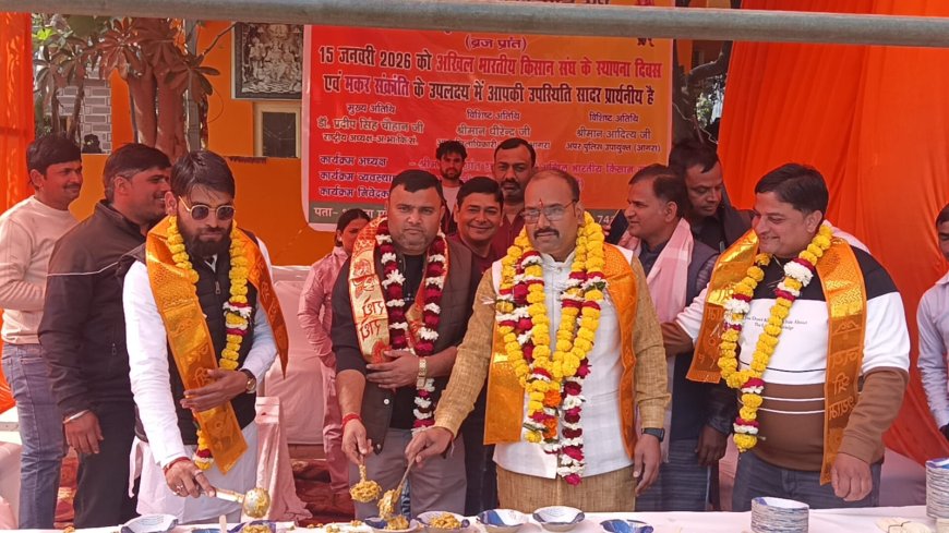 अखिल भारतीय किसान संघ के 39वें स्थापना दिवस एवं मकर संक्रांति के पावन अवसर पर गुरुवार को सिकंदरा भावना स्टेट पुलिस चौकी के समीप खिचड़ी भोज एवं भंडारे का भव्य आयोजन किया गया। यह कार्यक्रम अखिल भारतीय किसान संघ, ब्रज प्रांत के मंत्री अजय चौहान के नेतृत्व में संपन्न हुआ।