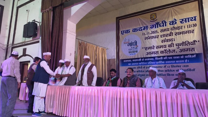 सर्व सेवा संघ की राजघाट वाराणसी से राजघाट दिल्ली तक चल रही 1000 किलोमीटर लंबी ऐतिहासिक पदयात्रा के 41वें दिन आगरा कॉलेज, आगरा में गांधी विचार और लोकतंत्र की दिशा पर विशेष संवाद सभा आयोजित हुई। सभागार में हम विश्वगुरु नहीं, हम विश्व मित्र हैं और देश में बदलाव सिर्फ युवा वर्ग ही ला सकता है जैसे उद्बोधनों से पूरा परिसर गांधीवादी ऊर्जा से भर उठा। इस पूर्व पदयात्री संजय प्लेस स्थित शहीद स्मारक पर भी पहुंचे और शहीदों को श्रद्धांजलि अर्पित की।