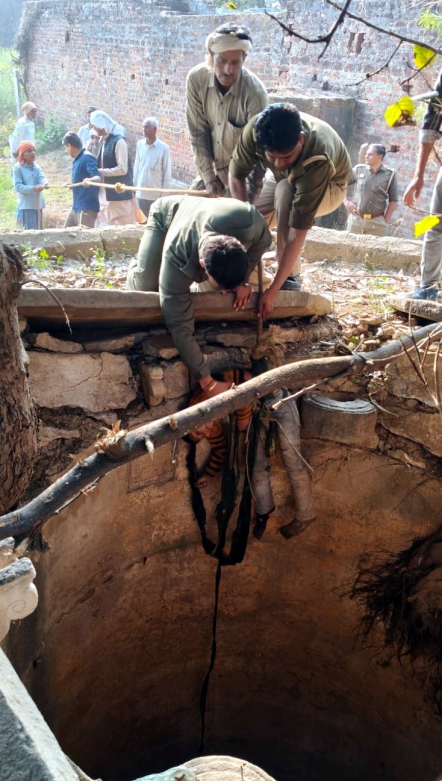 कुएं से सनी के शव को बाहर निकालते ग्रामीण।